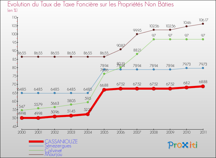 A Cassaniouze, le taux de taxe foncière sur le non bâti a donc augmenté de 37.82 % entre 2000 et 2011.