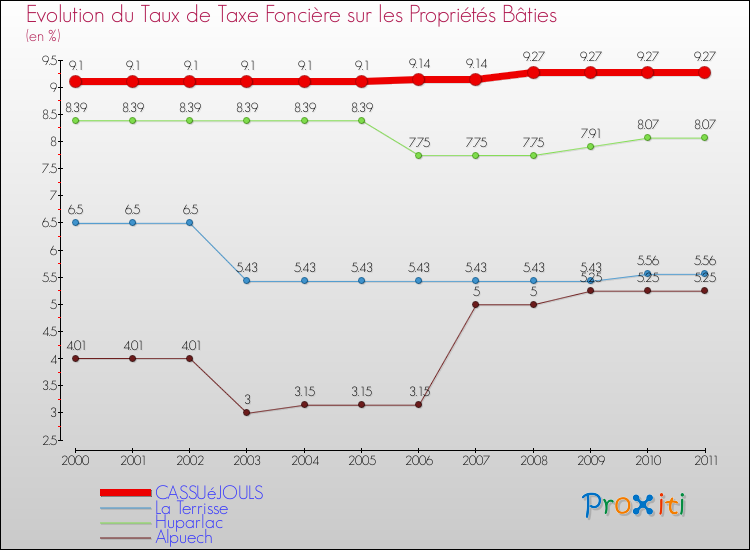 A Cassuéjouls, le taux de taxe foncière sur le bâti a donc augmenté de 1.87 % entre 2000 et 2011.