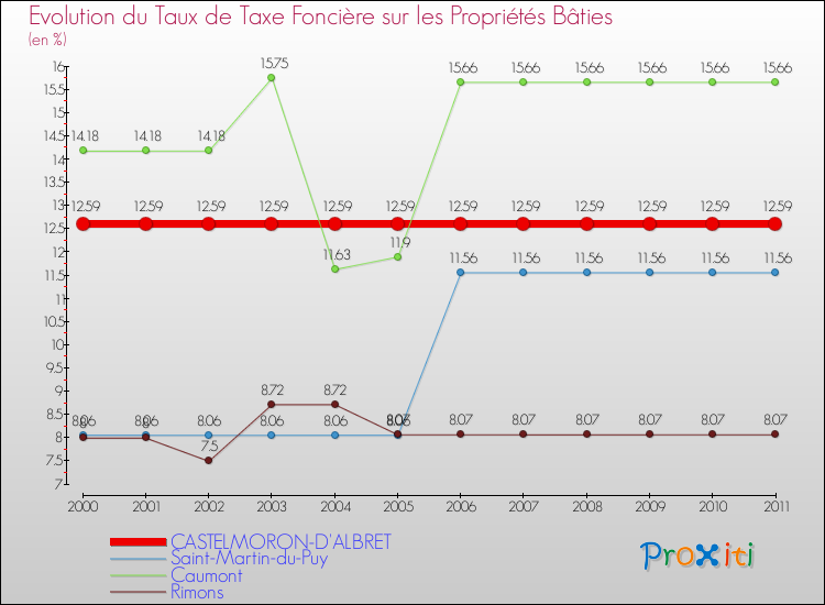 A Castelmoron-d'Albret, le taux de taxe foncière sur le bâti a donc augmenté de 0 % entre 2000 et 2011.