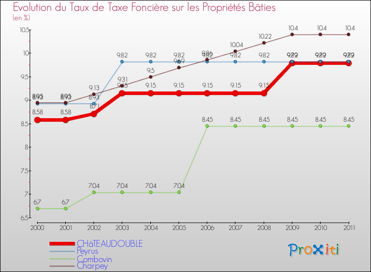 Pendant la même période, les communes françaises similaires à Châteaudouble, ont vu leur taux de taxe foncière sur le bâti augmenter de 23.4 % en moyenne entre 2000 et 2011.
