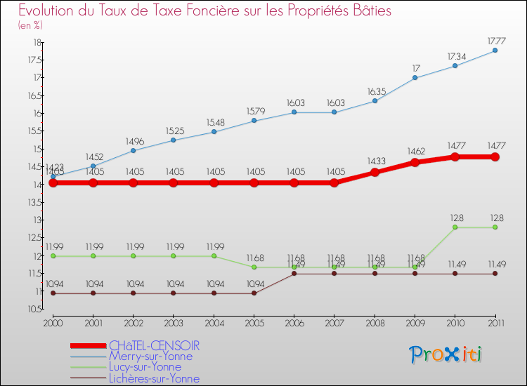 En 2011, le taux de la taxe foncière sur le bâti vôté par le conseil municipal de Châtel-Censoir était de : 14.77 %.