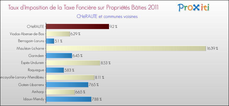 En 2011, le taux de la taxe foncière sur le bâti vôté par le conseil municipal de Chéraute était de : 9.2 %.
