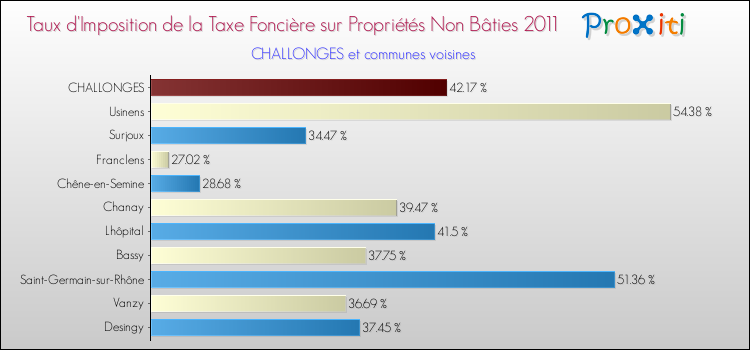 En 2011, le taux de la taxe foncière sur le non bâti vôté par le conseil municipal de Challonges était de : 42.17 %.