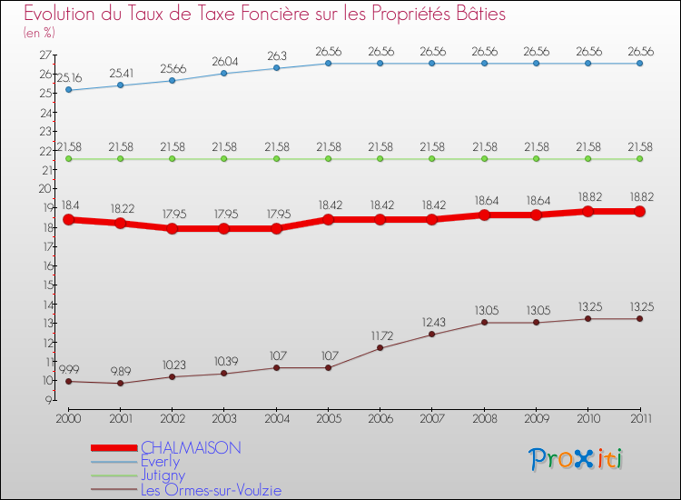 En 2011, le taux de la taxe foncière sur le bâti vôté par le conseil municipal de Chalmaison était de : 18.82 %.
