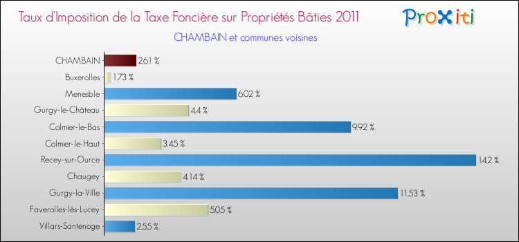 A noter : la valeur moyenne de ce taux de taxe foncière sur le bâti dans les communes françaises similaires à Chambain était de 10.11 %, en 2011.