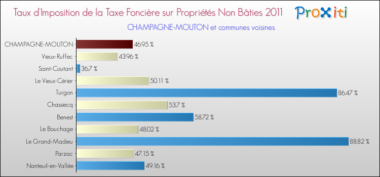 En 2011, le taux de la taxe foncière sur le non bâti vôté par le conseil municipal de Champagne-Mouton était de : 46.95 %.