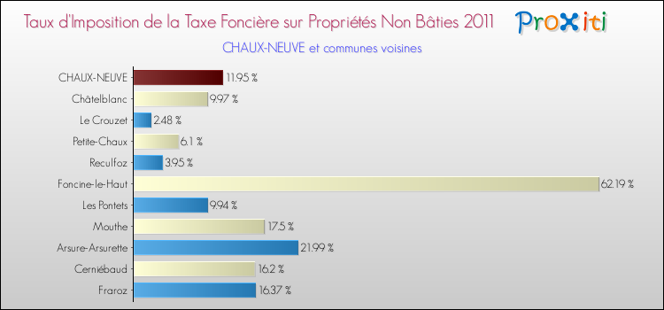 En 2011, le taux de la taxe foncière sur le non bâti vôté par le conseil municipal de Chaux-Neuve était de : 11.95 %.