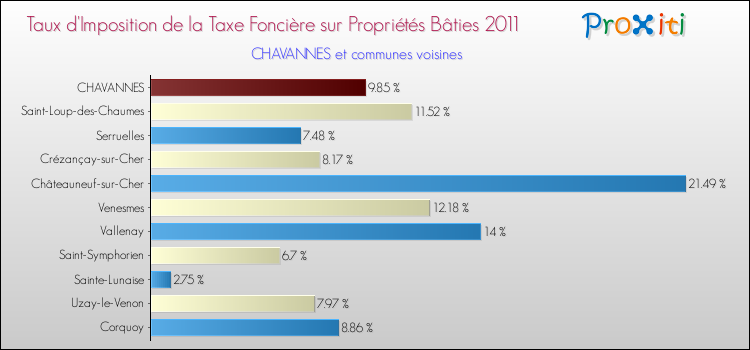 A noter : la valeur moyenne de ce taux de taxe foncière sur le bâti dans les communes françaises similaires à Chavannes était de 10.11 %, en 2011.