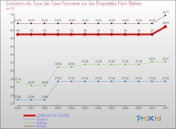 En 2011, le taux de la taxe foncière sur le non bâti vôté par le conseil municipal de Chenay-le-Châtel était de : 40.89 %.