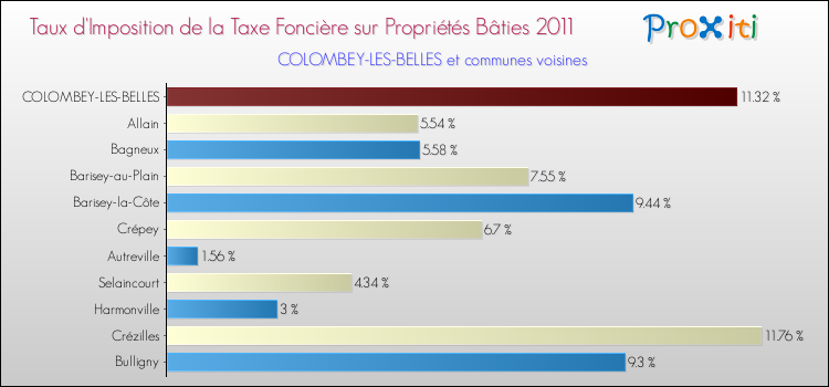 En 2011, le taux de la taxe foncière sur le bâti vôté par le conseil municipal de Colombey-les-Belles était de : 11.32 %.