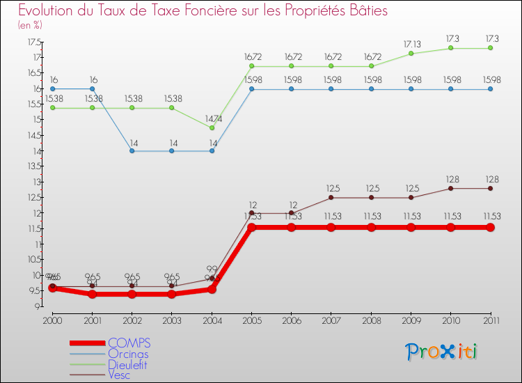 Pendant la même période, les communes françaises similaires à Comps, ont vu leur taux de taxe foncière sur le bâti augmenter de 45.04 % en moyenne entre 2000 et 2011.