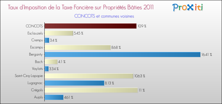 En 2011, le taux de la taxe foncière sur le bâti vôté par le conseil municipal de Concots était de : 10.9 %.