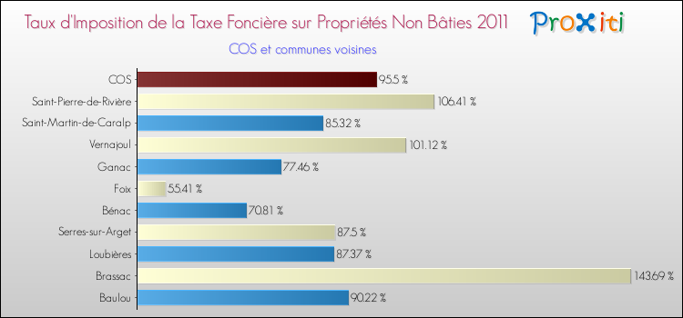 Vous trouverez ci-dessous des graphiques qui vous permettent de situer le taux de la taxe foncière sur le non bâti de Cos par rapport aux communes voisines.