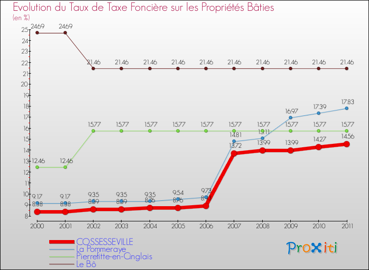 Pendant la même période, les communes françaises similaires à Cossesseville, ont vu leur taux de taxe foncière sur le bâti augmenter de 45.04 % en moyenne entre 2000 et 2011.