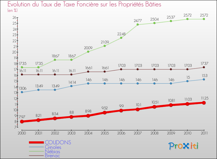 A Coudons, le taux de taxe foncière sur le bâti a donc augmenté de 41.15 % entre 2000 et 2011.