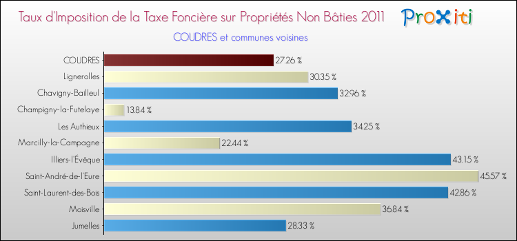En 2011, le taux de la taxe foncière sur le non bâti vôté par le conseil municipal de Coudres était de : 27.26 %.