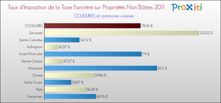 En 2011, le taux de la taxe foncière sur le non bâti vôté par le conseil municipal de Coudures était de : 78.56 %.