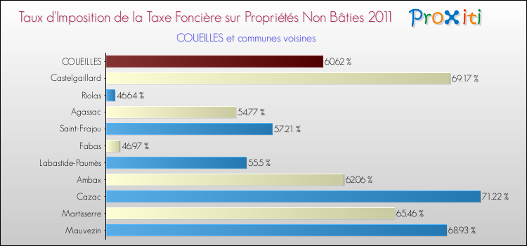 Vous trouverez ci-dessous des graphiques qui vous permettent de situer le taux de la taxe foncière sur le non bâti de Coueilles par rapport aux communes voisines.