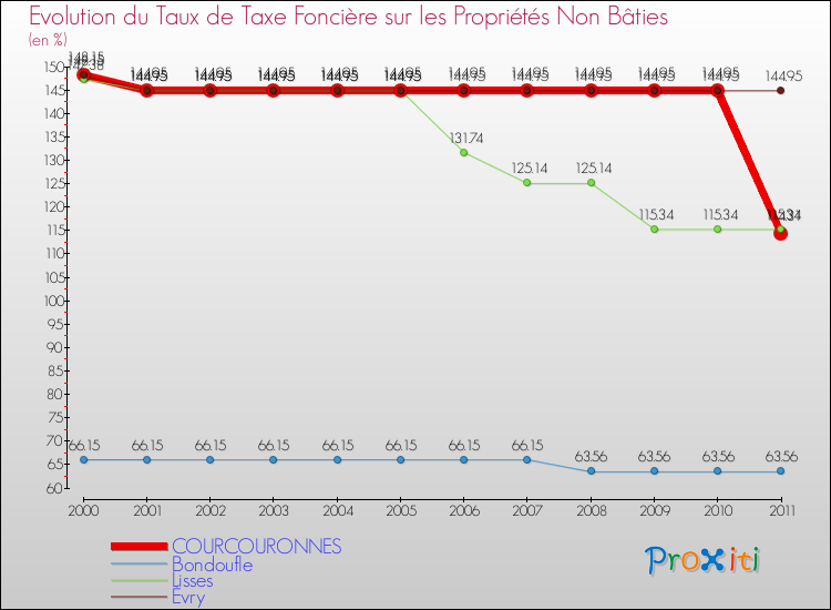 Pendant la même période, les communes françaises similaires à Courcouronnes, ont vu leur taux de taxe foncière sur le non bâti baisser de 17.55 % en moyenne entre 2000 et 2011.