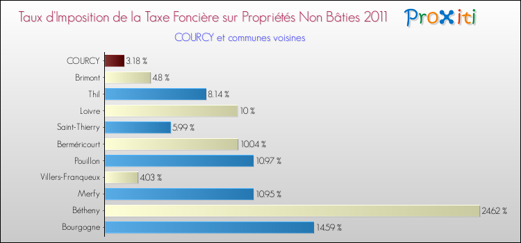 En 2011, le taux de la taxe foncière sur le non bâti vôté par le conseil municipal de Courcy était de : 3.18 %.