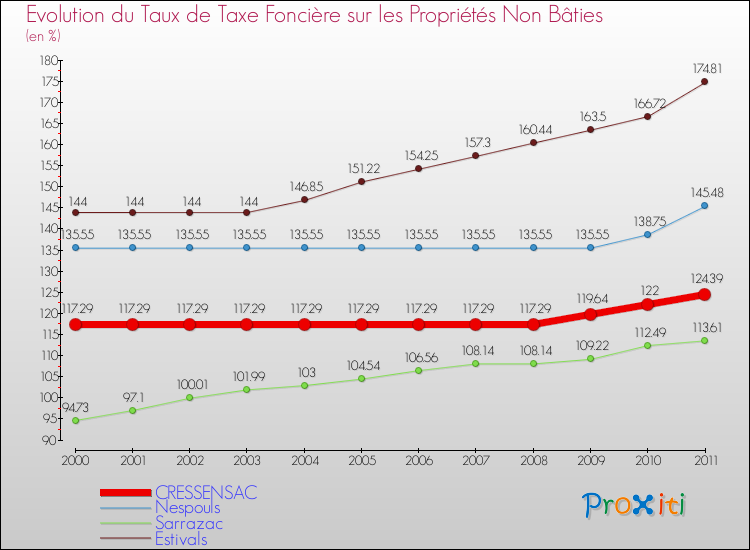 Pendant la même période, les communes françaises similaires à Cressensac, ont vu leur taux de taxe foncière sur le non bâti augmenter de 15.45 % en moyenne entre 2000 et 2011.