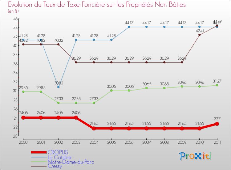 Pendant la même période, les communes françaises similaires à Cropus, ont vu leur taux de taxe foncière sur le non bâti baisser de 16.07 % en moyenne entre 2000 et 2011.