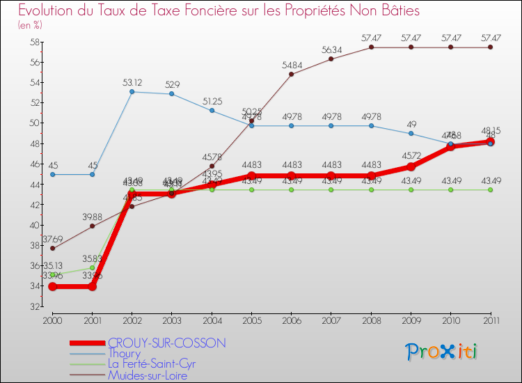 En 2011, le taux de la taxe foncière sur le non bâti vôté par le conseil municipal de Crouy-sur-Cosson était de : 48.15 %.