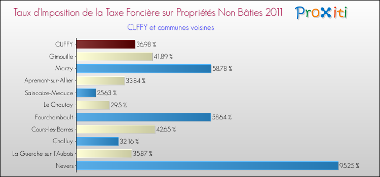 En 2011, le taux de la taxe foncière sur le non bâti vôté par le conseil municipal de Cuffy était de : 36.98 %.