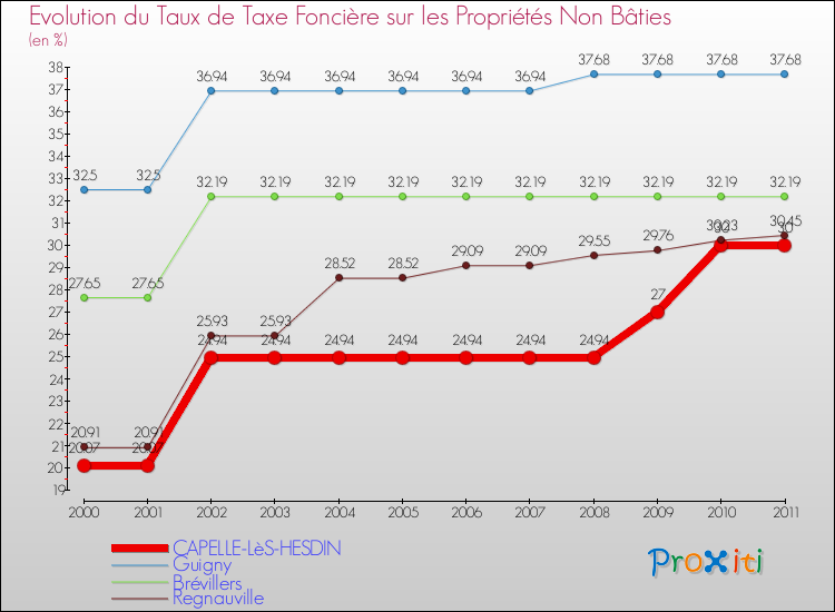 Pendant la même période, les communes françaises similaires à Capelle-lès-Hesdin, ont vu leur taux de taxe foncière sur le non bâti augmenter de 45.41 % en moyenne entre 2000 et 2011.
