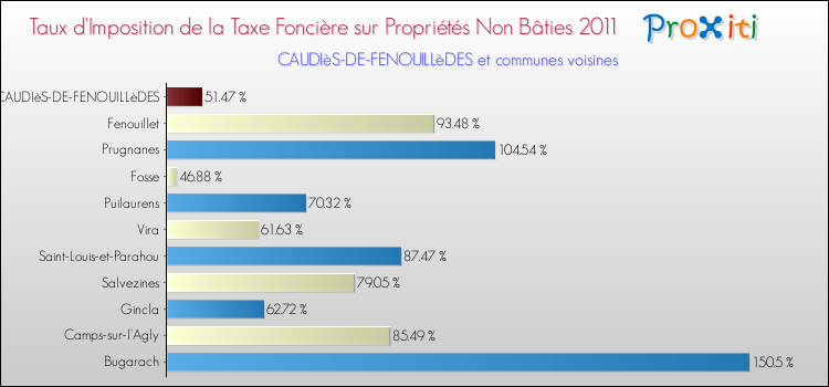 A noter : la valeur moyenne de ce taux de taxe foncière sur le non bâti dans les communes françaises similaires à Caudiès-de-Fenouillèdes était de 46.03 %, en 2011.