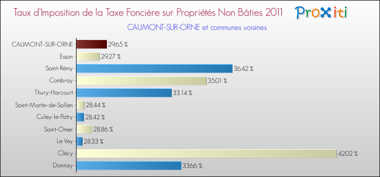 Pendant la même période, les communes françaises similaires à Caumont-sur-Orne, ont vu leur taux de taxe foncière sur le non bâti augmenter de 49.83 % en moyenne entre 2000 et 2011.