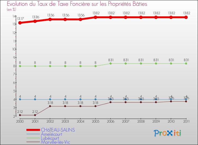 Pendant la même période, les communes françaises similaires à Château-Salins, ont vu leur taux de taxe foncière sur le bâti augmenter de 3.63 % en moyenne entre 2000 et 2011.