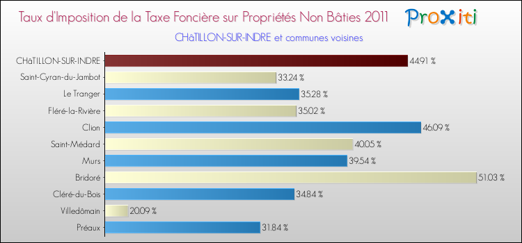 En 2011, le taux de la taxe foncière sur le non bâti vôté par le conseil municipal de Châtillon-sur-Indre était de : 44.91 %.