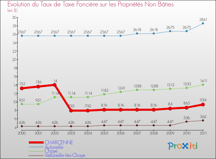 Pendant la même période, les communes françaises similaires à Charcenne, ont vu leur taux de taxe foncière sur le non bâti baisser de 11.8 % en moyenne entre 2000 et 2011.
