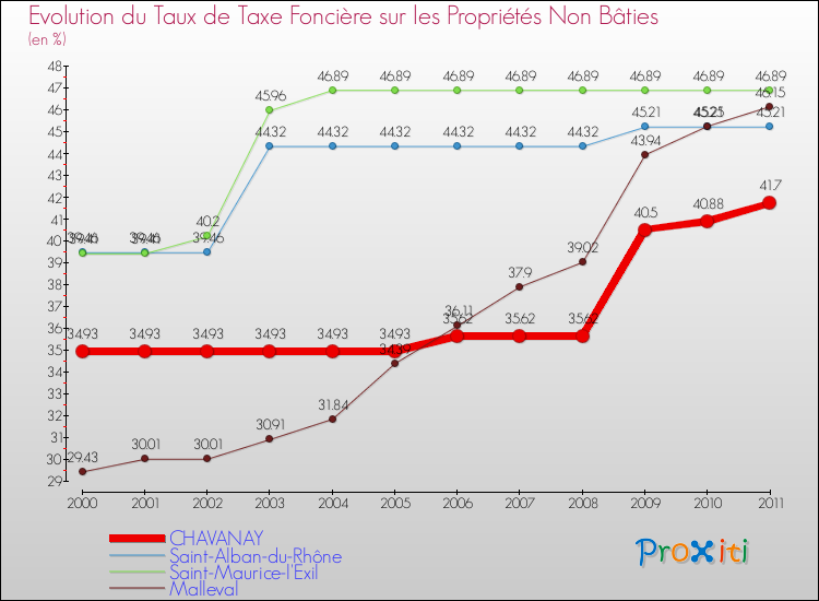 Pendant la même période, les communes françaises similaires à Chavanay, ont vu leur taux de taxe foncière sur le non bâti augmenter de 11.11 % en moyenne entre 2000 et 2011.