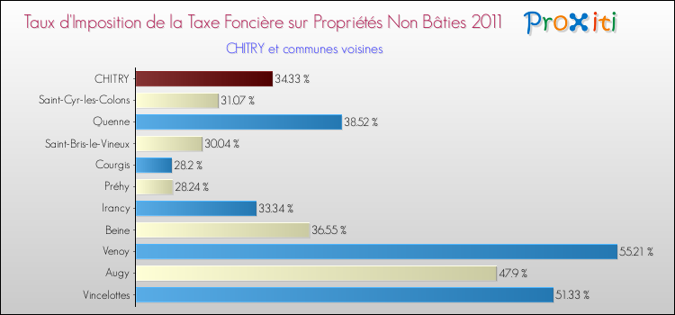 En 2011, le taux de la taxe foncière sur le non bâti vôté par le conseil municipal de Chitry était de : 34.33 %.