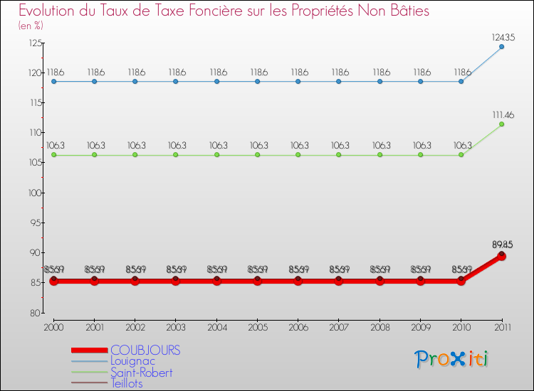 A Coubjours, le taux de taxe foncière sur le non bâti a donc augmenté de 4.85 % entre 2000 et 2011.