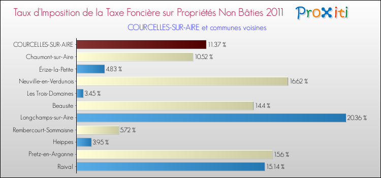 En 2011, le taux de la taxe foncière sur le non bâti vôté par le conseil municipal de Courcelles-sur-Aire était de : 11.37 %.