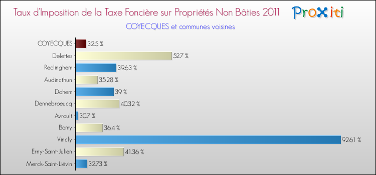 En 2011, le taux de la taxe foncière sur le non bâti vôté par le conseil municipal de Coyecques était de : 32.5 %.