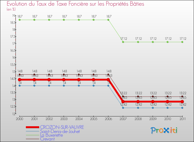 A Crozon-sur-Vauvre, le taux de taxe foncière sur le bâti a donc baissé de 10.95 % entre 2000 et 2011.