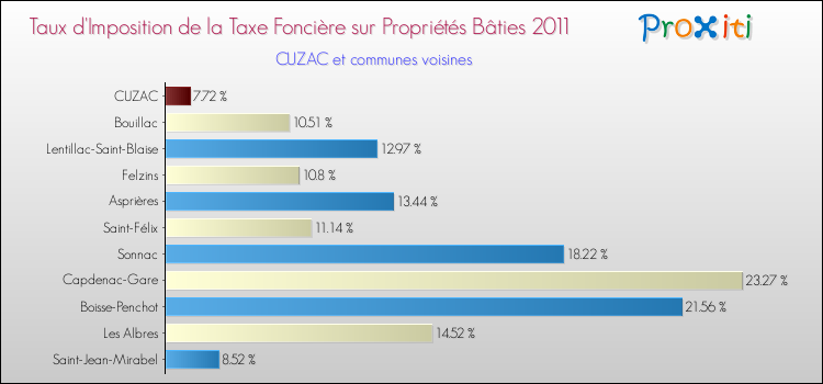 En 2011, le taux de la taxe foncière sur le bâti vôté par le conseil municipal de Cuzac était de : 7.72 %.