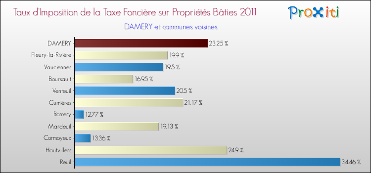 A noter : la valeur moyenne de ce taux de taxe foncière sur le bâti dans les communes françaises similaires à Damery était de 13.42 %, en 2011.