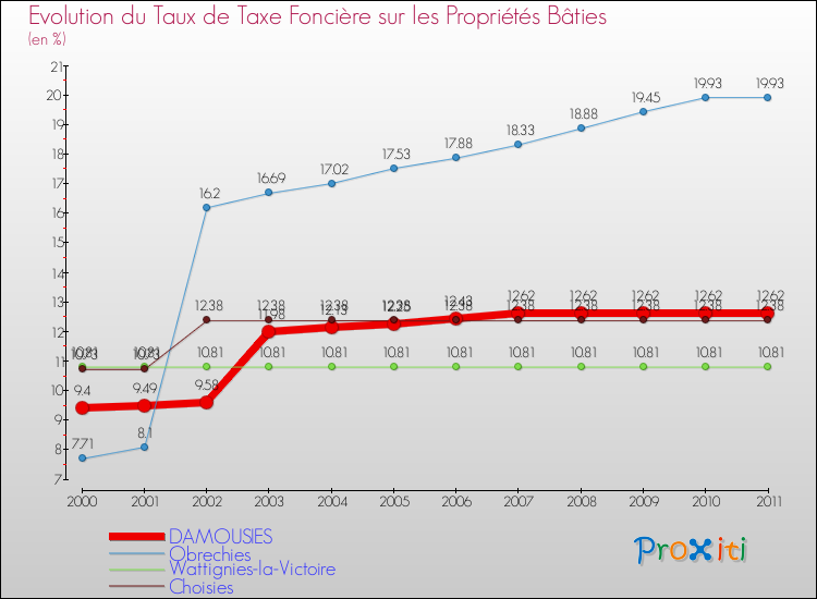 Pendant la même période, les communes françaises similaires à Damousies, ont vu leur taux de taxe foncière sur le bâti augmenter de 7.9 % en moyenne entre 2000 et 2011.