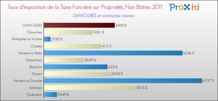 Vous trouverez ci-dessous des graphiques qui vous permettent de situer le taux de la taxe foncière sur le non bâti de Damousies par rapport aux communes voisines.