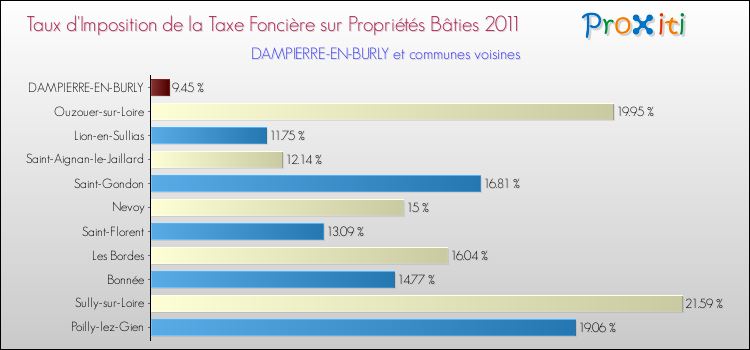 A noter : la valeur moyenne de ce taux de taxe foncière sur le bâti dans les communes françaises similaires à Dampierre-en-Burly était de 15.82 %, en 2011.