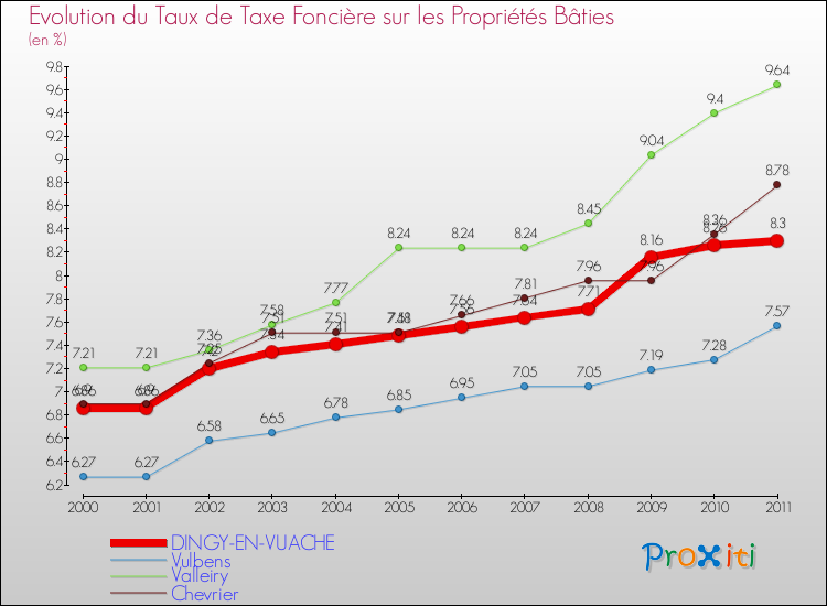 A Dingy-en-Vuache, le taux de taxe foncière sur le bâti a donc augmenté de 20.99 % entre 2000 et 2011.