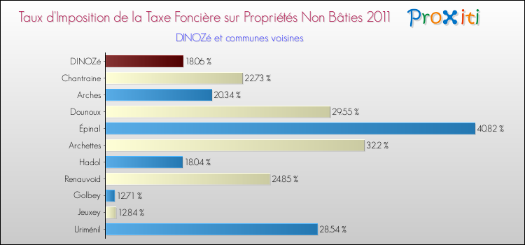 En 2011, le taux de la taxe foncière sur le non bâti vôté par le conseil municipal de Dinozé était de : 18.06 %.