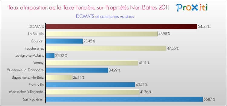 En 2011, le taux de la taxe foncière sur le non bâti vôté par le conseil municipal de Domats était de : 54.56 %.