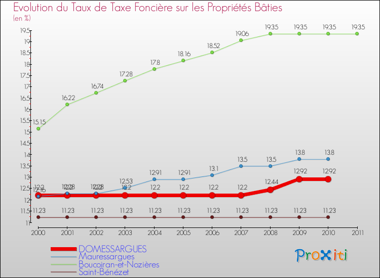 Pendant la même période, les communes françaises similaires à Domessargues, ont vu leur taux de taxe foncière sur le bâti augmenter de 22.45 % en moyenne entre 2000 et 2011.