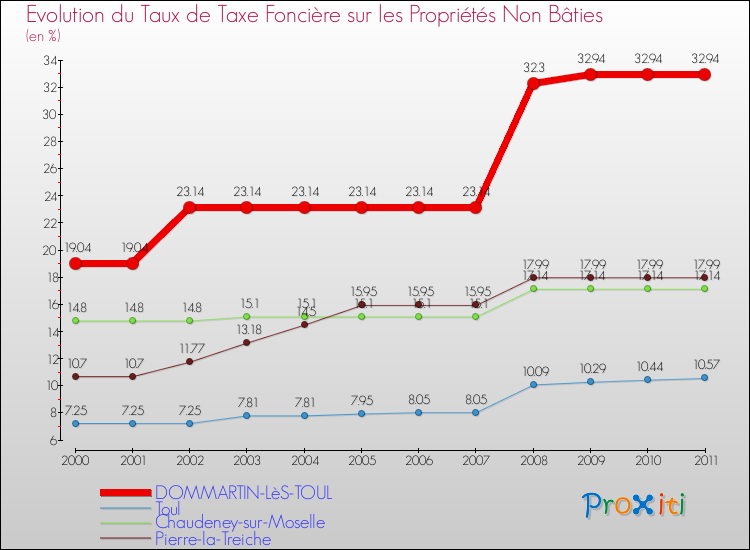 Pendant la même période, les communes françaises similaires à Dommartin-lès-Toul, ont vu leur taux de taxe foncière sur le non bâti augmenter de 57.2 % en moyenne entre 2000 et 2011.